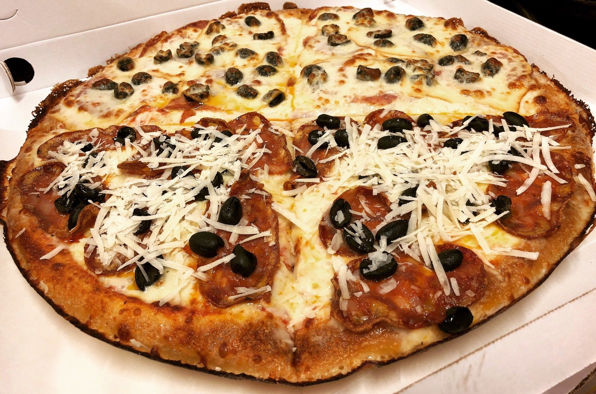 POMODORO MOZZARELLA SALAME PICCANTE OLIVE PECORINO